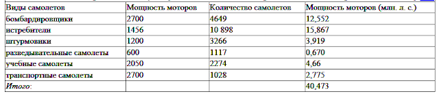 [78] Мощность моторов бомбардировщиков рассчитана как средняя между мощностью «Ю-88» и «ХЕ-111», истребителей — как средняя между «МЕ-109г» и «ФВ-190а», для штурмовиков принята мощность «Ю-87». Мощность моторов разведывательных самолетов определена экспертно, учебных самолетов — как средняя между мощностью истребителей и бомбардировщиков, мощность транспортных самолетов приравнена к мощности бомбардировщиков. Источники данных — те же.